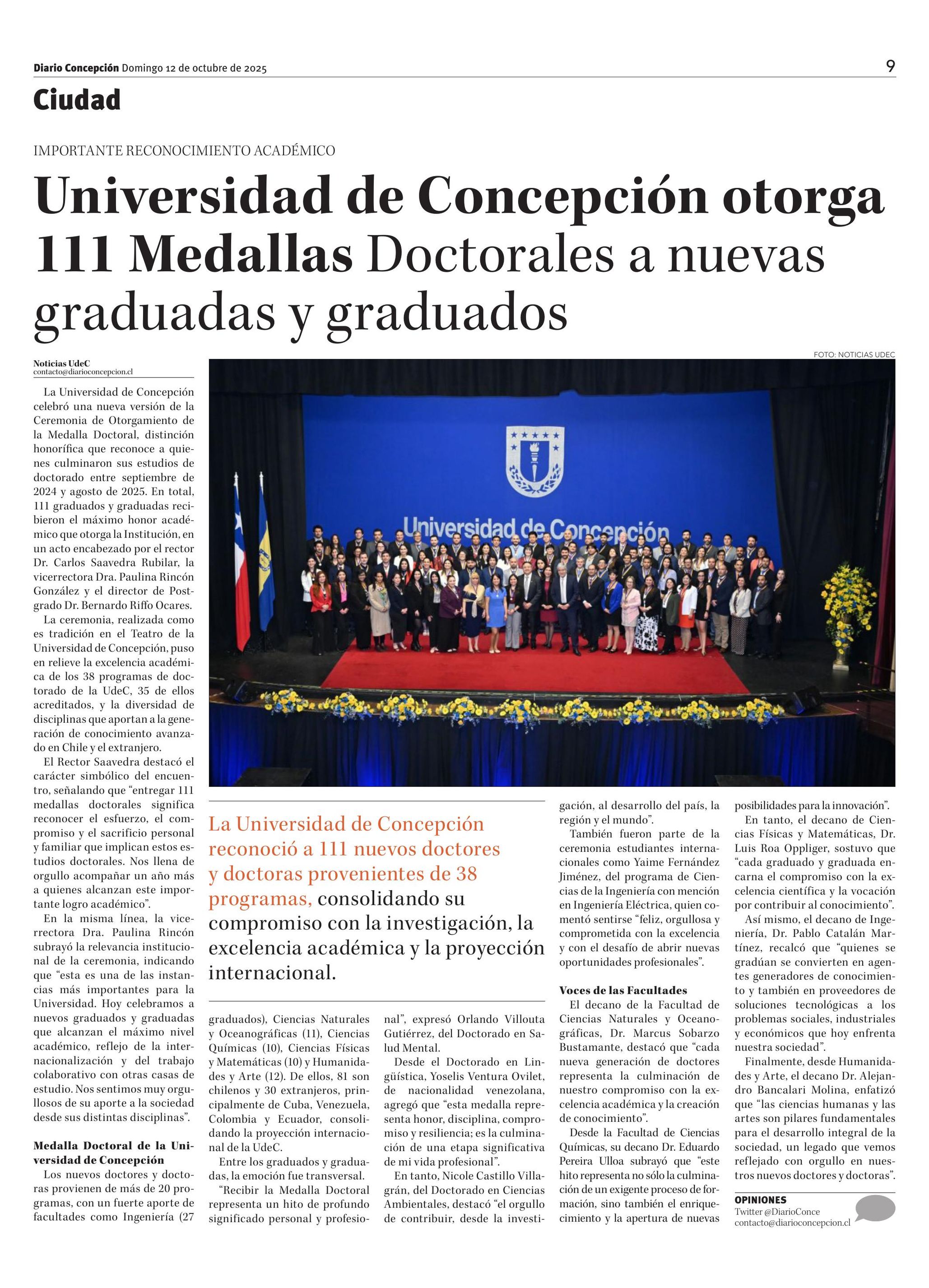Para más información visita Noticias UdeC: Universidad de Concepción otorga 111 Medallas Doctorales a nuevas graduadas y graduados – Noticias UdeC